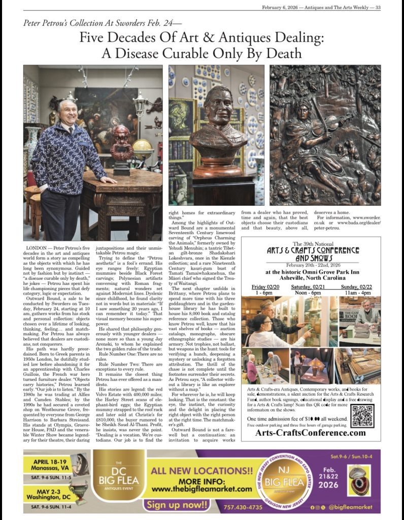 Peter Petrou’s five decades in the art and antiques world form a story as compelling as the objects with which he has long been synonymous. Guided not by fashion but by instinct – “a disease curable only by death,” he jokes – Petrou has spent his life championing pieces that defy category, logic or expectation. Outward Bound, to be held on Tuesday 24 February 2026, gathers works from his stock and personal collection: objects chosen over a lifetime of looking, thinking, feeling… and matchmaking. For Petrou has always believed that dealers are custodians, not conquerors.