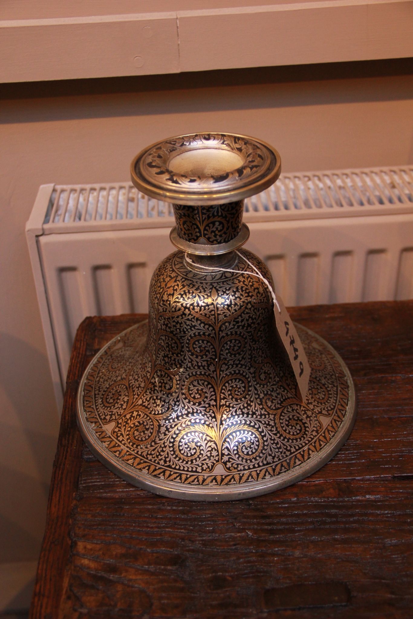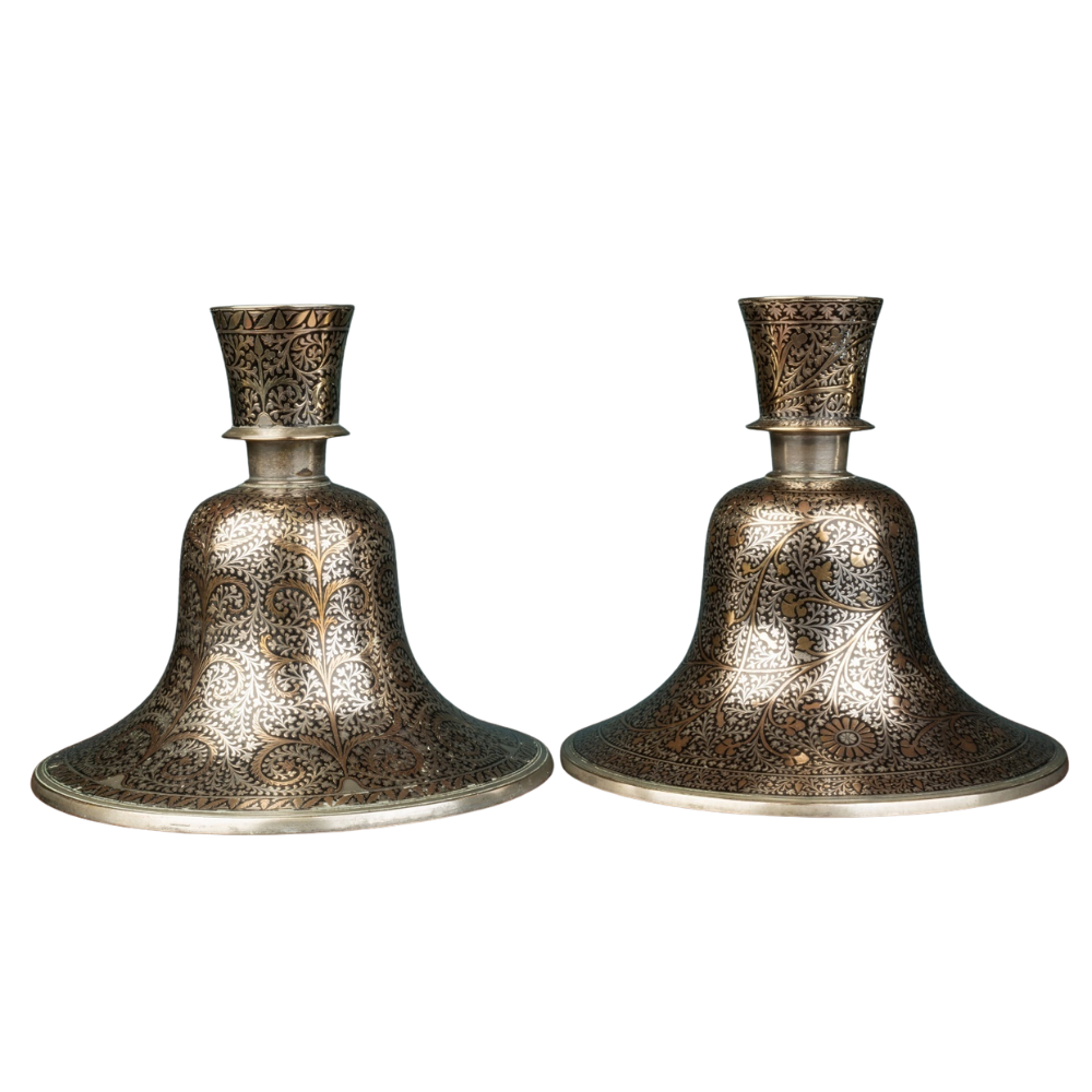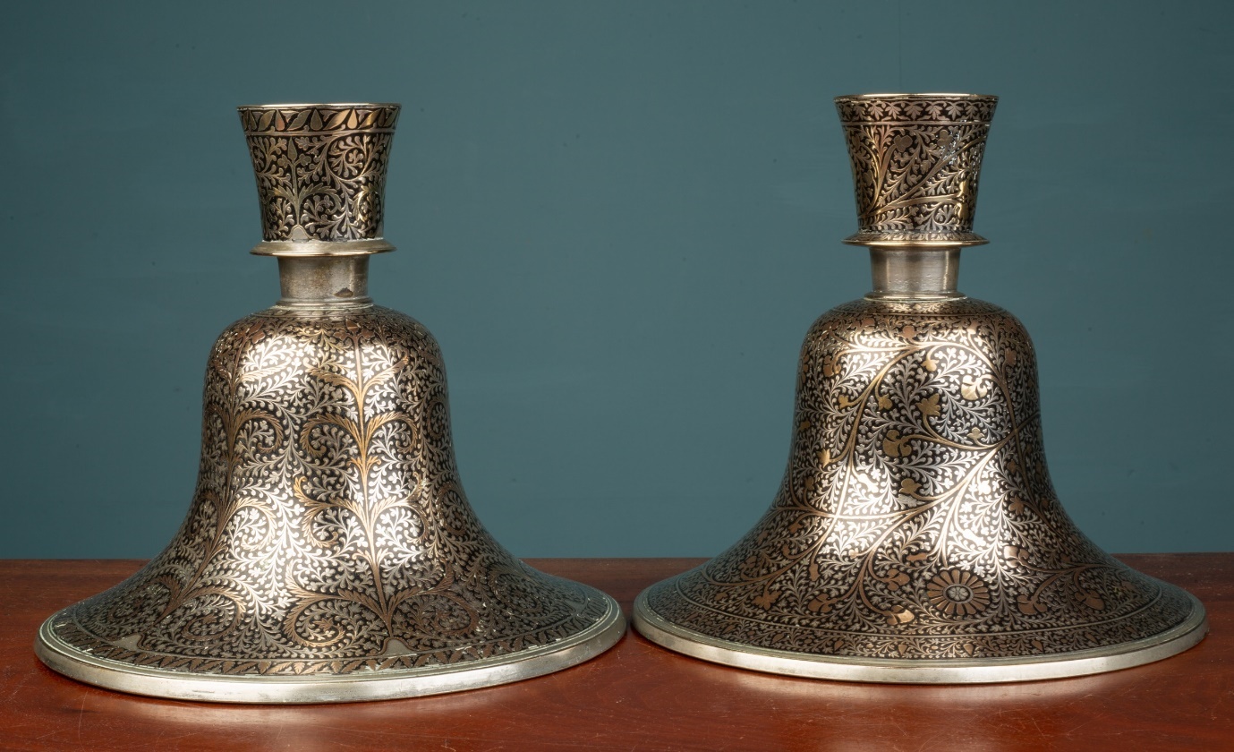 A pair of Indian Mughal silver and brass inlaid candlesticks, converted from Hookah bases. Circa1900