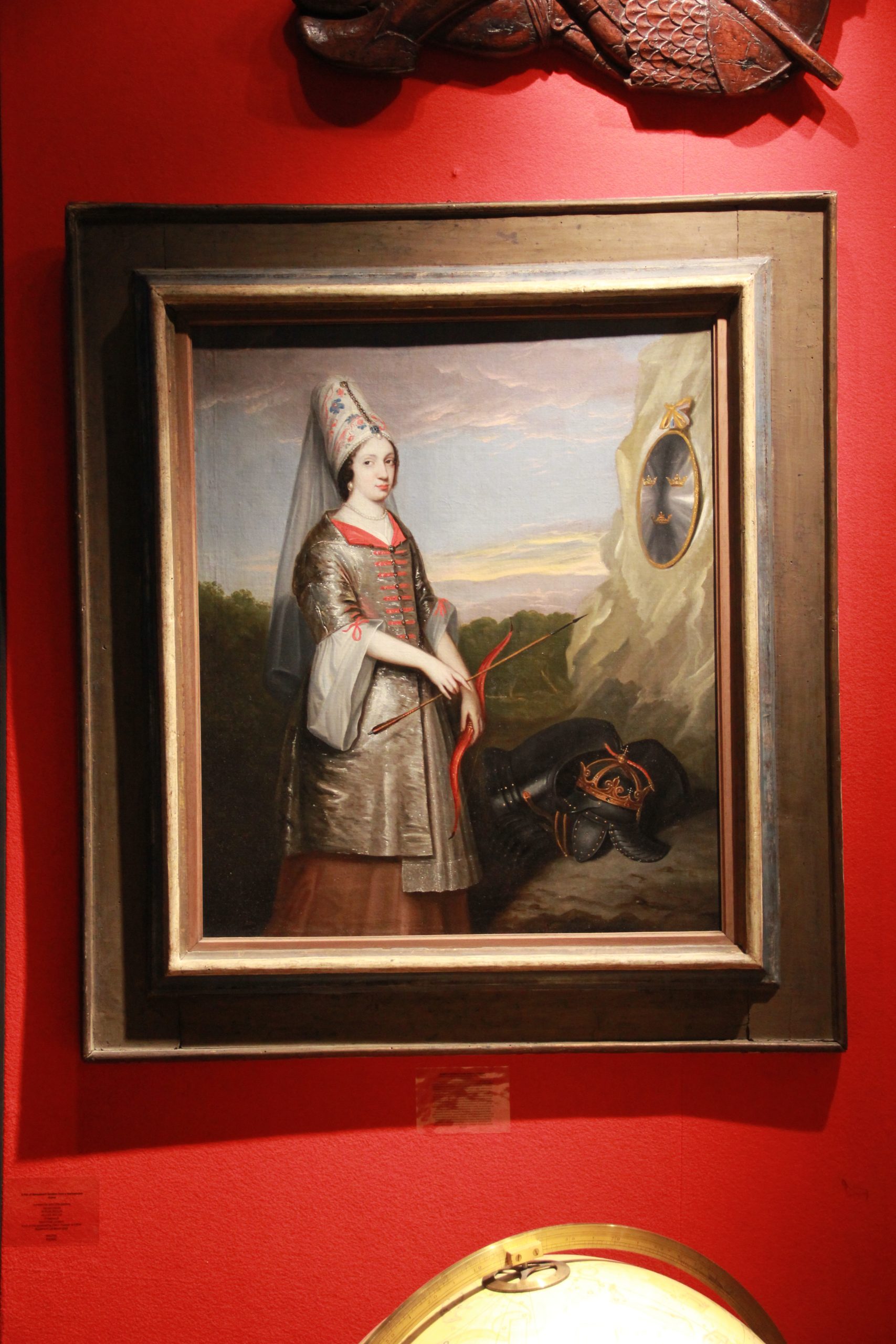 This evocative historicist painting dramatizes the spiritual and political transformation of Queen Christina of Sweden (1626–1689), who famously abdicated her Protestant throne in 1654 to convert to Catholicism and settle in Rome. Depicted in regal metallic robes and an ornate headdress, Christina stands before a rocky outcrop at sunset—her gaze turned toward a mirrored image of a helmeted figure, likely her father, Gustavus Adolphus. The discarded armour and flag at her feet symbolise her renunciation of martial power and national identity in favour of intellectual and spiritual freedom.