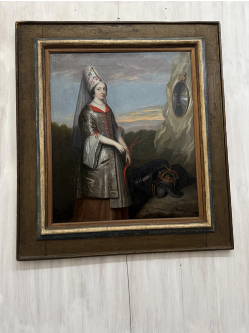 The painting was exhibited at the XI Exhibition of the Council of Europe at the Nationalmuseum Stockholm in 1966, as confirmed by the original label affixed to the reverse. It was formerly in the collection of Prof. Alessandro Parronchi, a distinguished Italian poet and art historian, and catalogued under the supervision of the Soprintendenza alle Gallerie – Firenze. The composition reflects the Romantic fascination with Christina’s legacy, blending Vanitas symbolism with theatrical allegory in a manner reminiscent of Johan Fredrik Höckert and the broader Swedish historicist school.