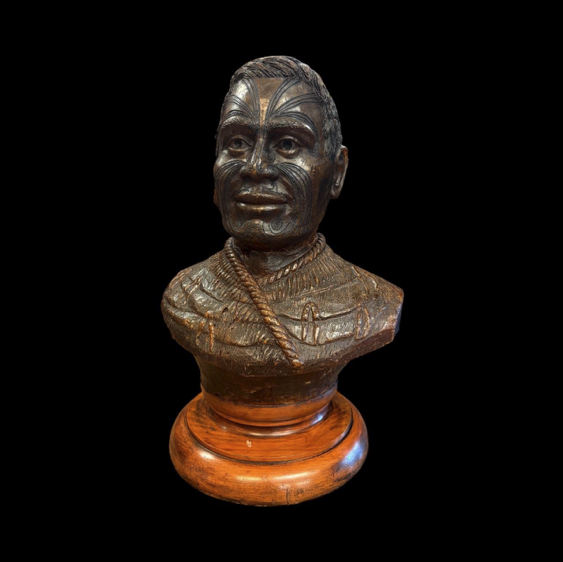 Tamaiwhakanehua’s participation in the Treaty—a foundational agreement between the British Crown and Māori chiefs—marks this bust as a sculptural tribute to Māori sovereignty and diplomacy. Its scale, material rarity, and named subject distinguish it as a significant work of Pacific portraiture, bridging ethnographic reverence and historical narrative.
