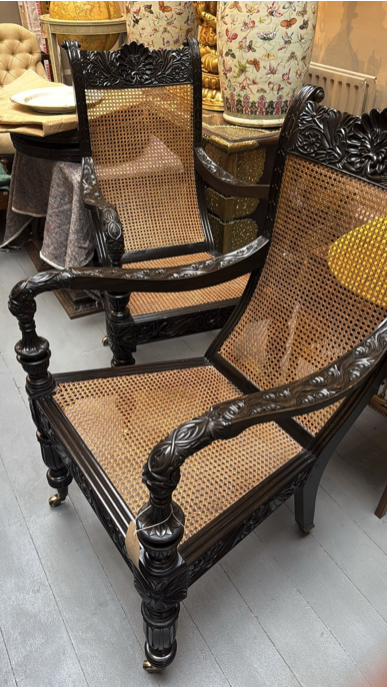 Exceptional mid-19th century armchairs carved from dense ebony, with woven cane panels and turned legs on castors. Their crisp floral ornamentation and functional detailing reflect early Madras workshop virtuosity, blending British form with Indian craftsmanship.