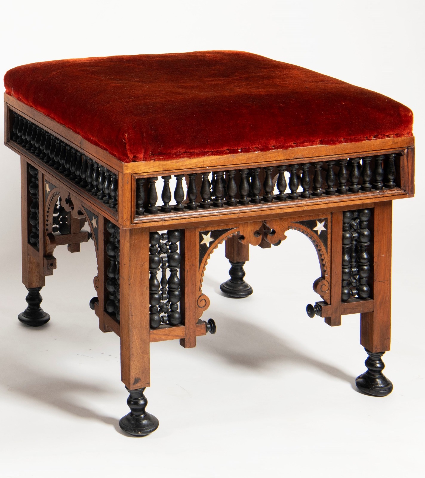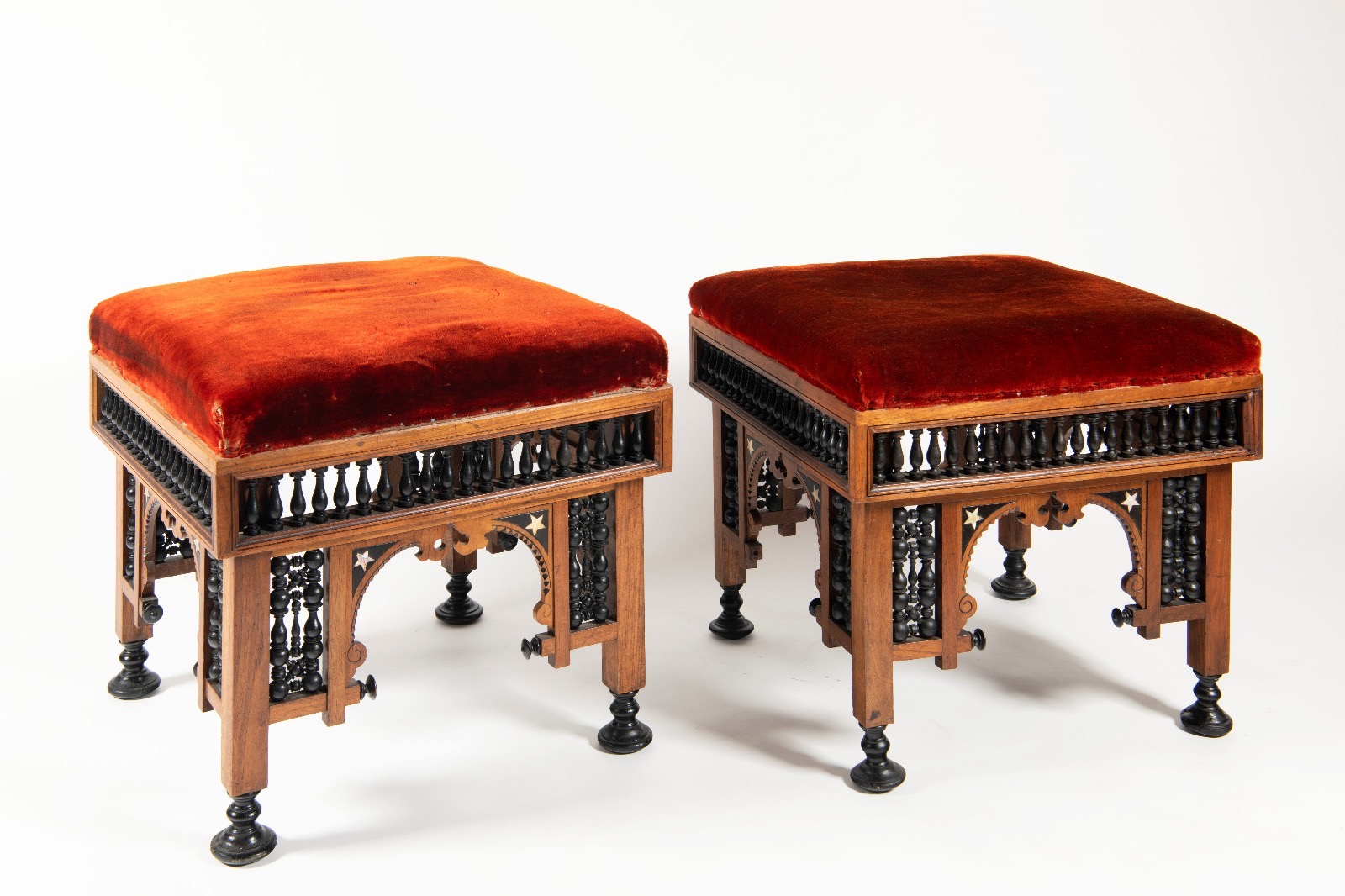 Pair of stools by Giuseppe Parvis (1831-1909),H 46 cm , 50 x 50 cmParvis was an Italian cabinetmaker and furniture designer. He was born in Lomellina, in the Italian region of Piedmont, in 1831. He completed his studies at the Accademia Albertina in Turin, he then moved to Paris to practice as sculptor and engraver. Growing impatient of the lack of his success and in need of a change, in 1859 he left Paris and moved to Cairo, Egypt, where he quickly built a reputation for himself as a cabinetmaker, getting noticed and appreciated by the local governor Isma’il. he then won the  Gold Medal at the Universal Expositions in Paris in 1867, with his exotic design of the Egyptian pavilions, followed by further praise at the Expositions of Philadelphia in 1876, Milan in 1881 and Turin in 1884. Height 180 cm x Width 115 cm x Depth 51 cm