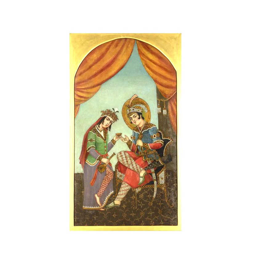 Two lovers, Iran, Quajar Revival circa 1900 or laterOil on canvas, he sitting in princely regalia holding a sceptre, she holding a cup and a bottle, framed 103 x 62.5cm